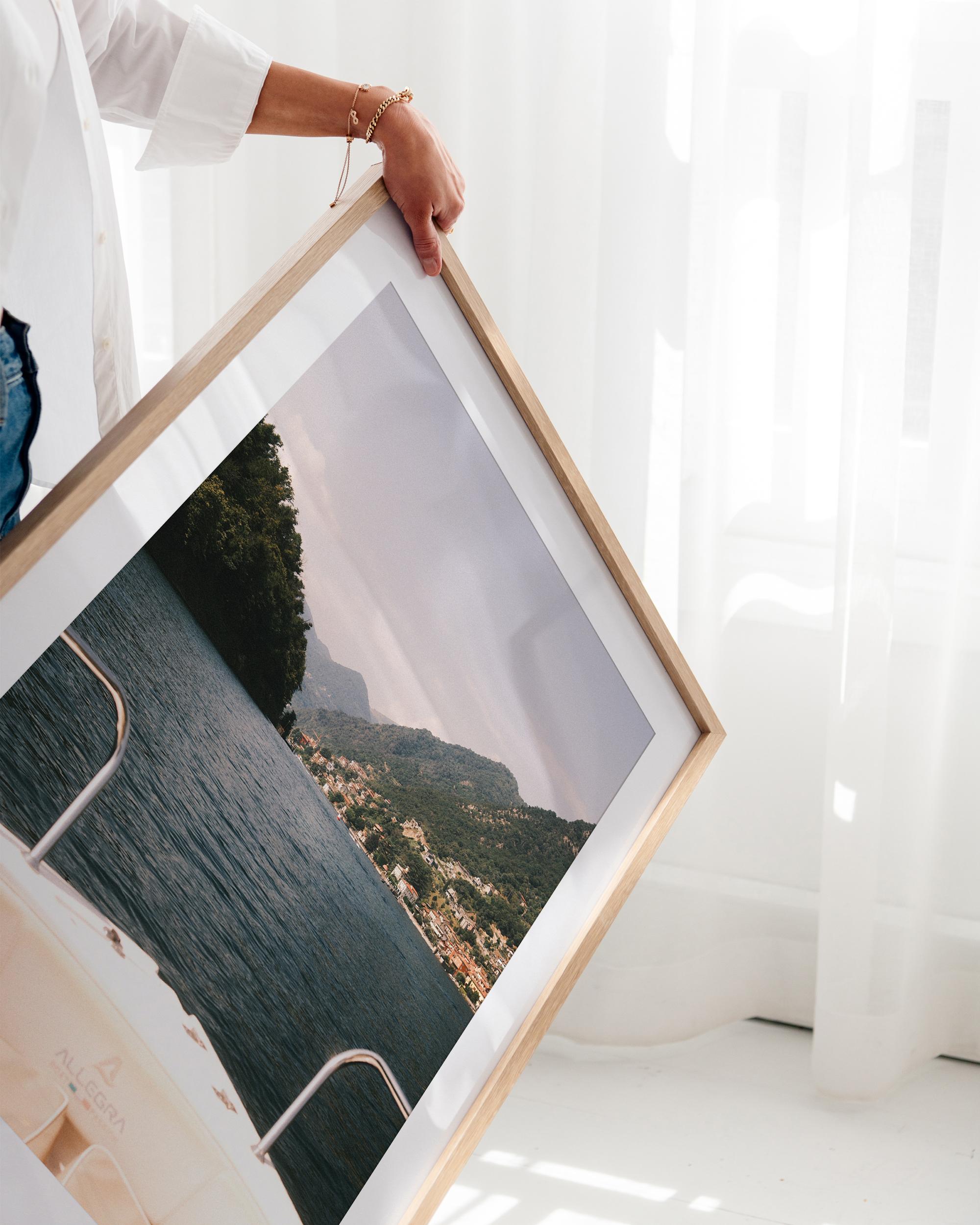 Each frame is crafted from solid ash, carefully milled and hand-finished to highlight the natural beauty of the wood. A specialist wax enriches the grain and protects the surface, giving a subtle lustre that endures for a lifetime. The box profile creates a strong gallery-style presence that draws the eye to the photograph. Assembled by hand and fitted with professional hardware, every frame arrives ready to hang from the moment you open the box.