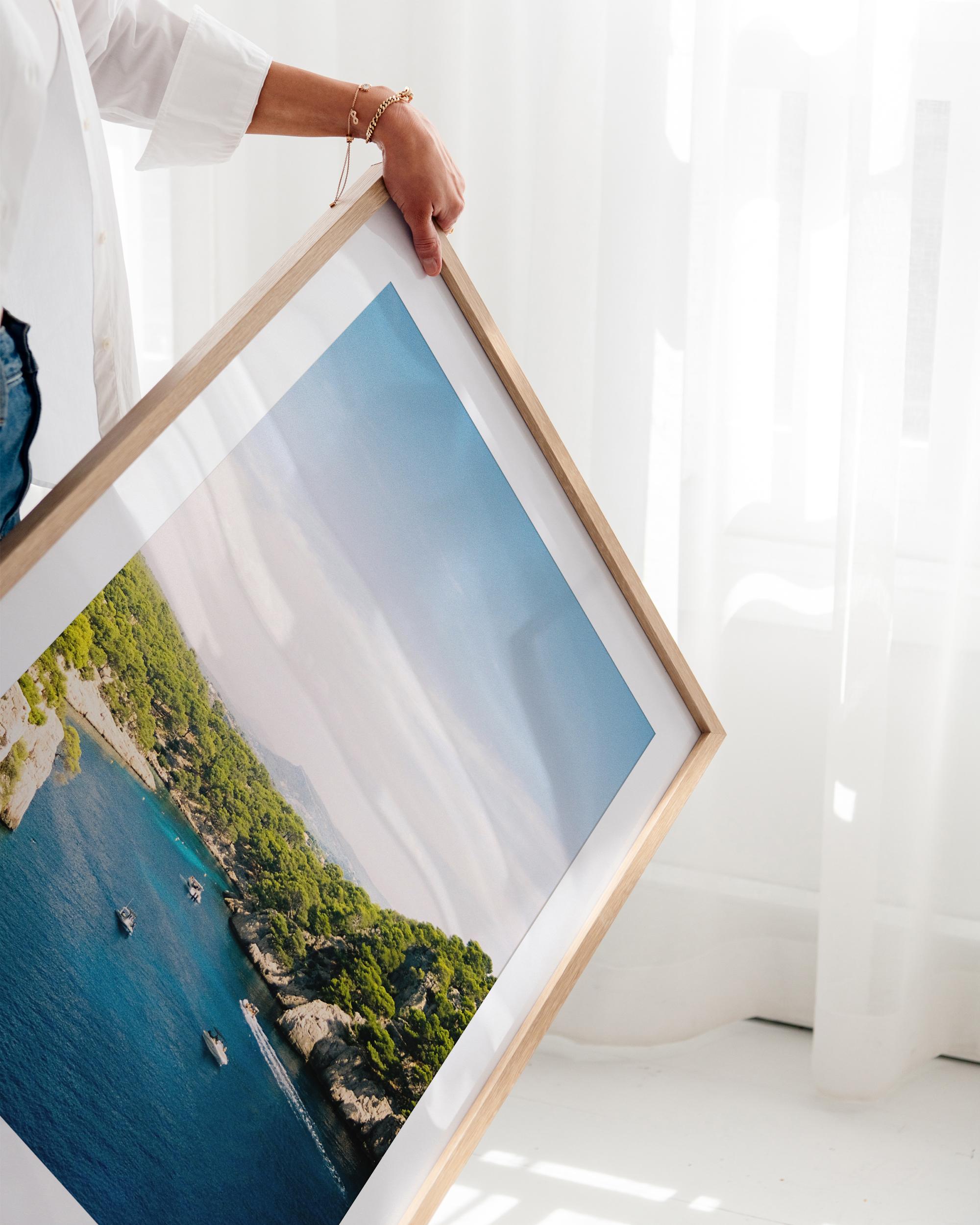 Each frame is crafted from solid ash, carefully milled and hand-finished to highlight the natural beauty of the wood. A specialist wax enriches the grain and protects the surface, giving a subtle lustre that endures for a lifetime. The box profile creates a strong gallery-style presence that draws the eye to the photograph. Assembled by hand and fitted with professional hardware, every frame arrives ready to hang from the moment you open the box.